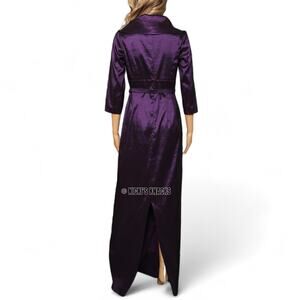 Make a regal entrance in this Eliza J purple taffeta evening gown, size 6. A luxurious satin-finish fabric meets timeless elegance with a shawl collar, 3/4 sleeves, faux wrap bodice, and fabric flower detail. The removable rhinestone belt cinches the waist for a flattering A-line silhouette, while a back slit adds movement. Fully lined with a concealed zip closure and perfect for weddings, galas, or any formal affair.