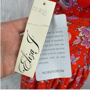 Vibrant red midi dress with floral pattern. Halter neckline. Flattering fit and flare design. Perfect for any occasion.