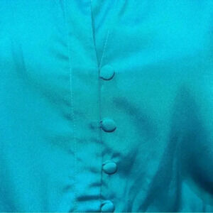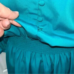 Description: Button front top half, lined, elastic comfort waist. Pleated back and sleeves, adding interest. Pretty silky green. Long sleeves. Appropriate for the office, church or to wear to a wedding.