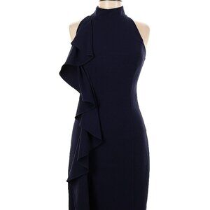 Sleeveless, mock, sheath, ruffle accents, blue, knee length