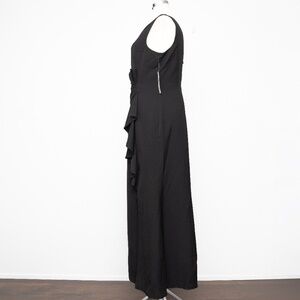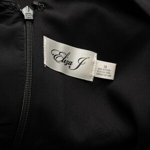 This Eliza J gown combines classic elegance with modern detailing, featuring a softly pleated bodice, cascading ruffle front, and a floor-length silhouette with a subtle side slit. Made from a comfortable scuba-knit fabric with a smooth lining, it offers a flattering shape that works beautifully for weddings, galas, or formal evenings.