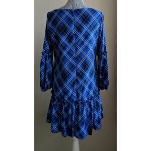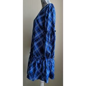 Blue/black plaid ruffle dress has a drop waist. Ruffles at sleeves and bottom of dress. Long sleeves. Hidden back zip.