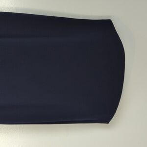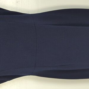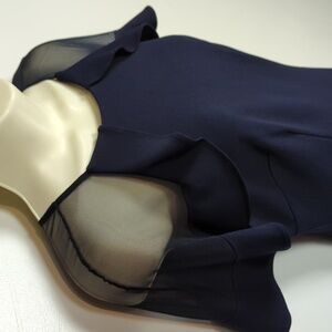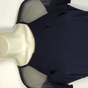 Navy blue. Rounded neckline. Sheer sleeves with ruffles through the shoulder. Zip back. Knee length. Fully lined. Excellent condition -- no stains, holes, or fraying. Laid flat pit-to-pit: 16in. Laid flat waist: 14in. Shoulder to hem: 42.5in.