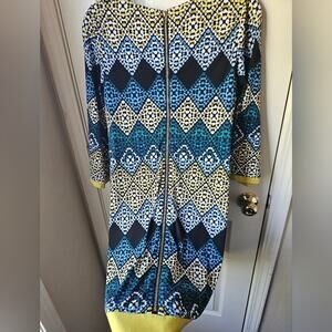 Beautiful high quality dress. In a 70s theme geometric pattern. Shift dress style, 3/4 length sleeves. Has a zip all the way down the back. In perfect condition, no signs of wear. Has a nice silk feel trim. Nice double lined fabric. Look stylish and chic with this Eliza J Retro Geometric Print Shift Dress. This dress features a round neckline, 3/4 bell sleeves, and a full zipper closure. The short dress has a colorful and unique geometric pattern that is perfect for any occasion - from casual to formal. Made with polyester and spandex, this dress is machine washable and easy to care for. The dress is lined and has some special accents like a zipper that add to its charm. It comes in size 4 and is perfect for women who want to make a statement with their fashion choices.