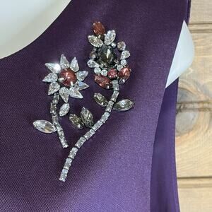 The Eliza J Shift Dress in Plum with sparkling Rhinestone Floral accent is a stylish and sophisticated choice for formal occasions like weddings and parties. This knee-length dress features a sleeveless design, round neckline, and an A-line skirt with princess waist detailing. Made from a blend of polyester and spandex, the dress is lined for added comfort and sophistication. The rich purple or plum color and designer theme make it a timeless piece that can be worn year-round with a Jackie O. silhouette and vibes. Perfect for those looking for elegant evening wear that combines classic style with modern accents. Pre-loved in good condition. Please view all photos. Thanks for looking!