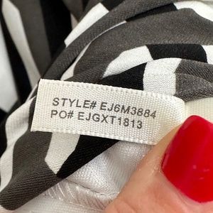 Compliments galore when you wear this adorable Eliza J Geometric print dress! Size 4, and completely flattering in black, white, gray & a pop of pink! Rounded neckline and short sleeves, fully lined, this dress is meant to hit just above or at the knee. Exposed gold back zipper. Measures 16.5" from pit to pit, and 35" long from the top to the bottom hem. Easy care; can be machine washed and dried. From a smoke/pet free home. Dress is in excellent condition, no flaws. Style # EJ6M3884 Buy with confidence!