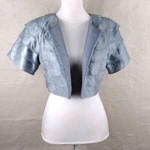 Eliza J. New York Women's Silver Peter Pan Ruffle Layered Short Sleeve One Clasp Open Front Dress Bolero Jacket. 71% Rayon, 18%. Lining: 100% Polyester. Measurements approx. Flat Lay. Pit to Pit: 18, Sleeves: 11.5, Length: 14. Size 12P. Two Piece Set. Only Jacket.