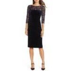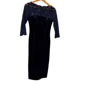 Eliza J Size 2 Lace Velvet Sheath Dress Dark Navy Blue Elegant Victorian Evening