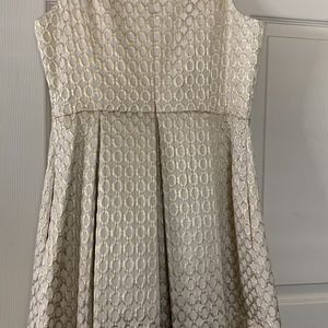 Beautiful and flattering fit & flare dress. Beige and gold metallic with hot pink lining.