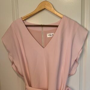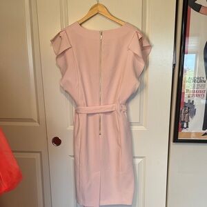 Eliza j pink dress with belt and flutter sleeves Chic midi dress in soft pink. Features a V-neck and matching belt. Ideal for versatile styling. No holes over from non-smoking home only worn once.