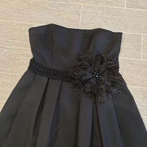 Eliza J Black Strapless dress. Dress has a square texture material and a beautiful Fabric Flower with Feathers. The top has a silicone band to help keep the dress up and the back has a zipper closure.