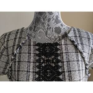 Black and white tweed shift dress has a lace panel on the front. Short sleeves. Hidden back zipper. Fringe details at shoulders, sleeves, and hemline.