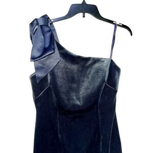 Stunning Eliza J velvet dress! The gray one-shoulder design, short train, and elegant bow detail create a sophisticated and eye-catching look. Perfect for your next special occasion. You'll love the flattering trumpet hemline and comfortable, figure flattering fit. Excellent pre-owned condition, like new!