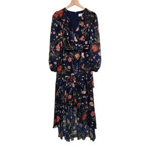 The Eliza J Women's Blue Floral Foil Print Surplice V Neck High Low Dress is a romantic and stylish piece perfect for weddings and parties. This A-line dress features a beautiful floral pattern on a blue background, long balloon sleeves, and a V-neck neckline with tiered ruffle accents. The high-low hem adds a touch of elegance, while the belted waist and zipper closure provide a flattering fit. Made of polyester, this dress is machine washable for easy care
