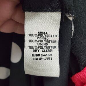 Black and white polka dot base with red stripe at bottom hemline. Pintucked flutter sleeves. Pockets. Dress has thin string belt loops, but the tie is no longer attached. Can be snipped off if desired. Size 14.