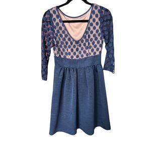 Eliza J Women's Navy Blue Polka Dot Mesh Bodice Dress 3/4 Sleeve Size 2