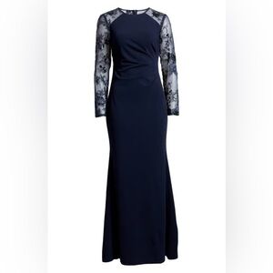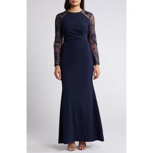 Sheerly chic sequined embroidery combines with sleek Laguna crepe in this Eliza J gown, a captivating combo to wear to a wedding or black-tie event.