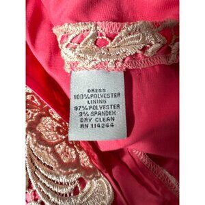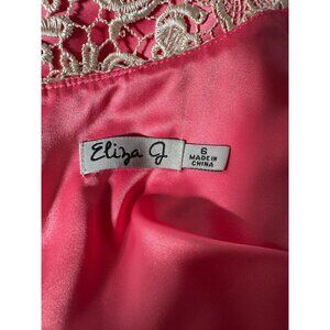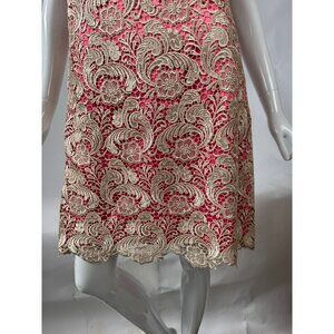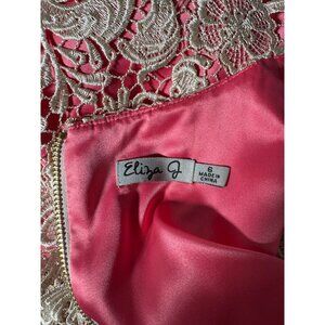 Step into a world of elegance with this stunning Eliza J lace dress. The delicate ivory floral overlay gracefully contrasts the vibrant pink, exuding sophistication. A timeless shift silhouette and intricate detailing make it a true standout piece, perfect for turning heads at evening soirees or special celebrations.