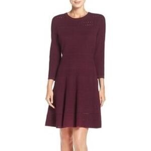Eliza J Women's Wine Sweater Dress With Cutwork 3/4 Sleeve Fit & Flare Size L
