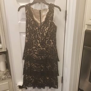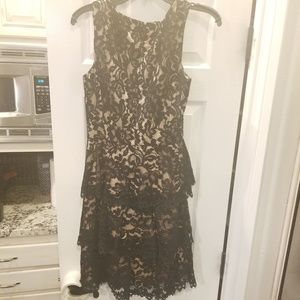 Elegant yet sexy lace dress with contrast lining flares at the waist and has three tiers of ruffles. Scalloped neckline shows off the decollete.