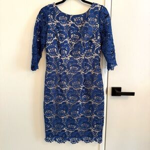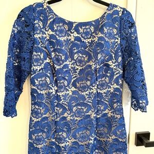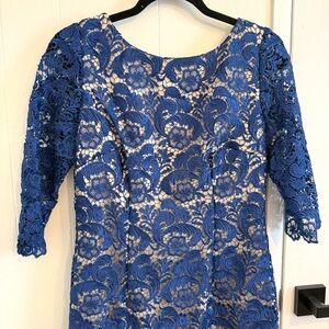 Eliza J blue lace cocktail dress. Fully lined, except for sleeves are see through. Zips up the back. Classic elegant silhouette. Gently used condition with no notable flaws or wear. Size 8.