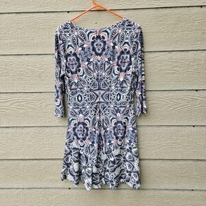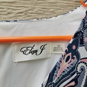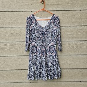 Eliza J damask print v neck 3/4 sleeve dress white navy pink size 12P petite