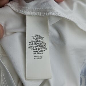 Cute v neck dress with 3/4 length sleeves. White and teal, with navy, pink, and beige damask pattern. Zips up the back for easy on/off. Lined. In good used condition with no known flaws. See photos for fabric and care details.