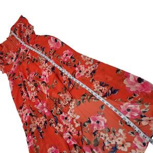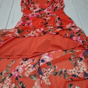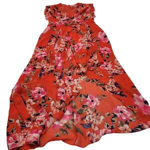 Lovely Eliza J Hi-Low maxi dress! Deep orange color with a floral print and a flowy feel. Gently worn, just has a small blemish on the V neckline from having a pin there. Size 12