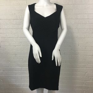Black sleeveless bustier sheath dress with zippered back & button at the back of neck. Vneck line & ribbed detail. Measurements are approximate and taken flat