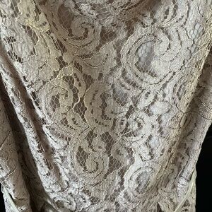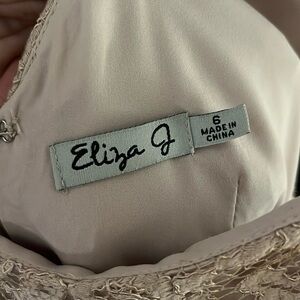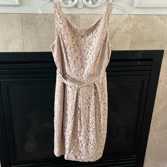 Eliza J tan and gold lace overlay dress. Has a belt. Worn once. Size 6. (Pc)