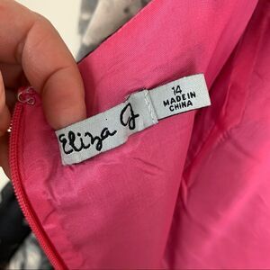 Eliza J Women’s Black and White floral Fit and Flare cocktail Dress w/Scoop Back and Pink Lining Sz 14 EUC. Flattering style, fully lined, substantial fabric and pockets. Zip back. Please see photos for additional details. Pit to Pit 20“ Waist 34“ Length 36“