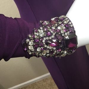 Crystal-encrusted cuffs encapsulate the sleek, understated elegance of this stretch-jersey gown that's ruched to enhance the figure. A superhigh front slit makes sure you drop jaws upon entrance.