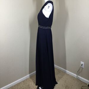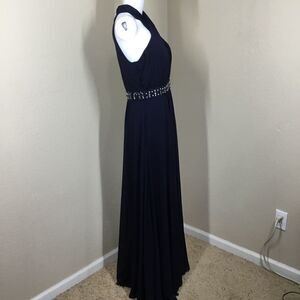 Elegant pleats texture this floor-sweeping chiffon gown that dazzles with a sleek crossed neckline and lustrous waist-cinching belt.