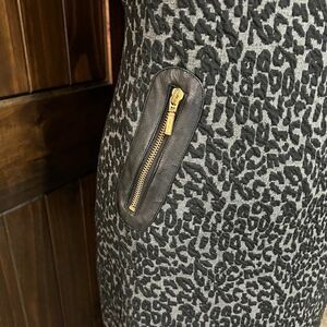 *Super sassy with a fitted look and pleated neckline. Features faux front pockets that are leather like trimmed and gold zipper with a gold zipper closure in the back. Dress is made of 73% Polyester, 26% Rayon and 1% Spandex. Dry clean only.