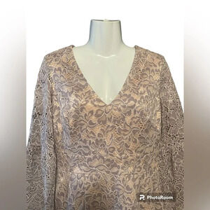 Lace detail in a cream underlay with a gray pale lavender lace overlay
