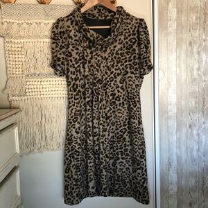 Eliza J Leopard Cowl Neck Puff Sleeve Dress. Fits like a large, size tag gown. See measurements below. Excellent condition. Lined. Cute pleats on chest.