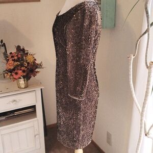 This is a bronze beauty.. Solid sequins on a silvery velvet background. Fully lined. Exposed back zip. Perfect sheath shape. Showing on my size 6 mannequin. Measures 36 at chest, 28 at waist, 36 at hips, 36 at bottom hem. 36 long from shoulder to hem. This color is flattering on everyone. Elegant and classic.