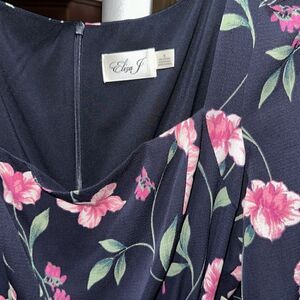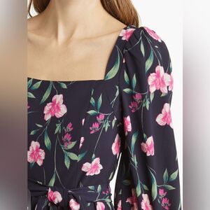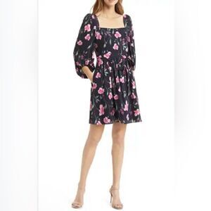 An undone bouquet animates this romantic dress designed with full sleeves and a sweetly squared neckline.