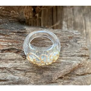 Gorgeous and unique Elizabeth Adams 14k gold and glass ring. Dome shape ring with faceted clear glass on front with 14k yellow gold detailed work and smooth glass shank. Ring measures .66 inches wide on front and shank is .20 inches wide. Tested 14k gold. Size 11