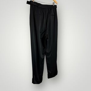 These Elizabeth and James pants are a stylish choice for career women in size 12. The high-rise, belted design offers a flattering fit, while the pleated and cuffed details add a touch of sophistication. Made from a blend of polyester and rayon in a classic black color, these pants are machine washable for easy care. Perfect for both party or business occasions, these pants feature a tapered leg style and ankle length, making them a versatile addition to any wardrobe.