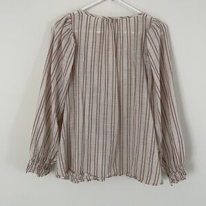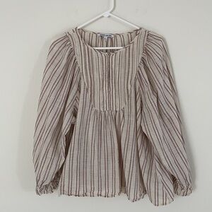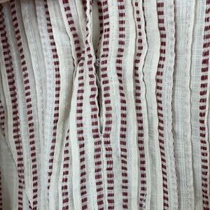 In good condition 100% Cotton, 100% polyester lining hook front closure has a slouchy peasant style textured cotton with striped stitching puff sleeves for comfortable movement.