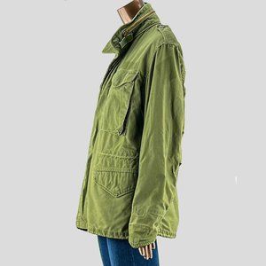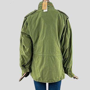 Elizabeth and James Jude Vintage Military Jacket in army green. Featuring a hidden hood, a concealed snap-down and zip front closure, and four front flap pockets. Stand collar with epaulets at the shoulder. Velcro closure at wrists. Slight intentional wear throughout.