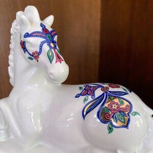 A horse set atop of a white ledge and decorated red, blue and green mosaic colors. Lidded Emporer's Stallion figurie trinket box made exclusively for Elizabeth Arden.