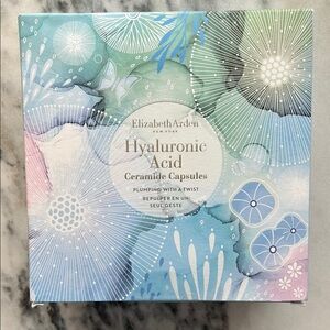 Elizabeth Arden skincare set with hyaluronic acid ceramide capsules. Includes cream and day cream. Elegant packaging.