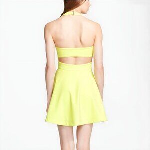The āDarrienā dress from Elizabeth and James features a flirty circle skirt, daring cutout back, exposed zippers, and halter necklineāall stitched in vibrant yellow stretch weave fabric.