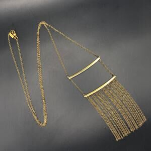 This is 24k gold plated and features 2 bars with pave cz hanging from the 26 1/2 long chain and gold plated chain fronge hanging below