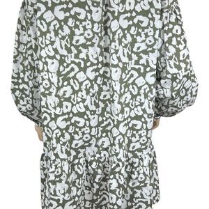 Mini length and features a high neck, ruffled hemline, and puff sleeves. The sage green print is made of a comfortable cotton blend. Machine wash and tumble dry for easy care.