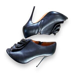Elizabeth and James black peep toe bootie shoes with zipper edge ruffle detail at vamp & side zip closures. Made in Italy. Original, Not Khol’s.