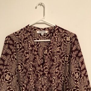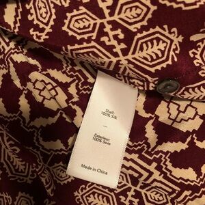 A kimono-inspired Elizabeth and James blouse has a tapestry print on crisp silk crepe. A single-button placket adds undone edge, and fine pleats add flowy dimension. Long sleeves.