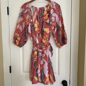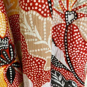 Elizabeth + James garden dress with bright red, orange, lavender purple, tan and black dotted and leaf motif pattern, peasant sleeves and neckline for bohemian look in rounded neck or off shoulders, flowy form with tie waist. Lined. Size XL. 100% cotton.